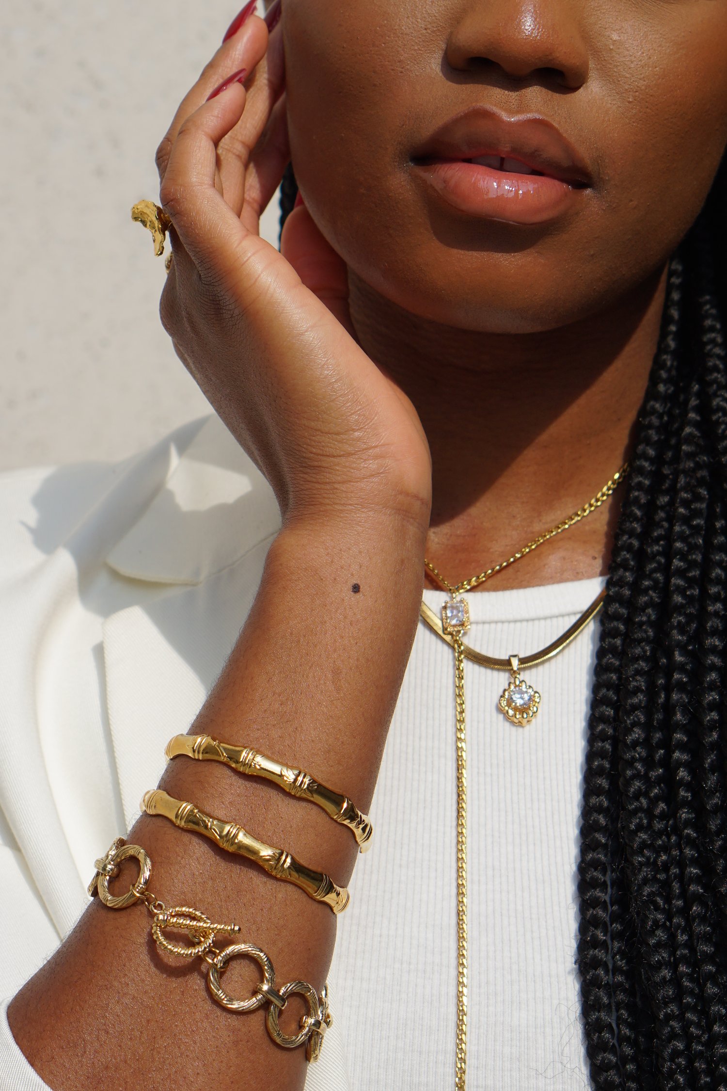 gold-plated adjustable cuff with bamboo-inspired details. ella is today considered a traditional female name used in old nordic society as far as back the 16th century. the word means godess in hebrew.